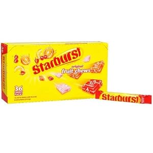 Do you need to buy INDICATIONS: Starburst Original Flavor Fruit Chews - 36 Individually wrapped packs of California Fruit flavored starburst fruit chews. The different STARBURST flavors are actually chosen for every variety based on consumer preference testing. A long evaluation process happens as a way to offer a refreshing fruit taste in each flavor for the consumer. Every STARBURST Brand strategy is made with real fruit juice or contains real fruit flavor. All in the STARBURST products provide Ascorbic acid using the exception of STARBURST Jellybeans which contain less than 2% in the Daily Value of Vitamin C. STARBURST Original Fruit Chews: cherry, orange, strawberry and lemon. STARBURST Fruit Chews are manufactured beneath the most stringent quality control processes. They use only high-quality ingredients which are cooked until the appropriate consistency is achieved. Then the candy is defined by having a sizing roll to be cut and individually wrapped. Although the manufacturing description sounds quite simple, it requires much technical knowledge to make STARBURST Fruit Chews.
